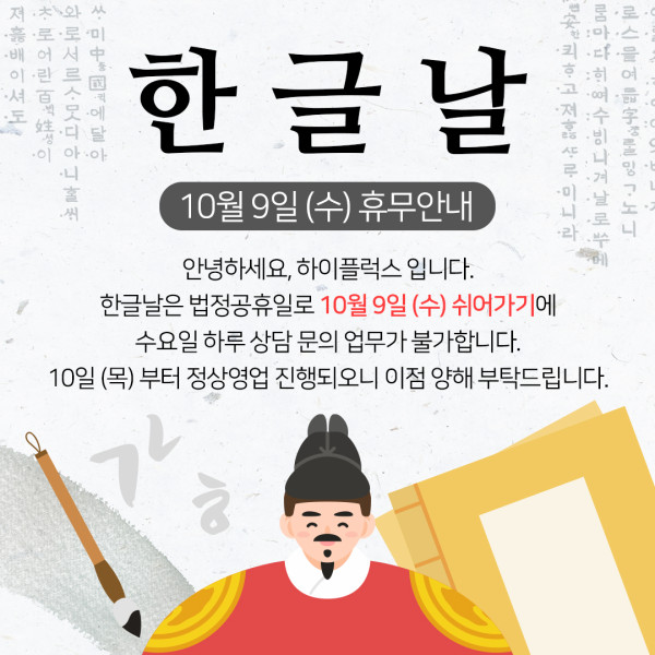 한글날은 법정공휴일로 10월 9일 (수) 쉬어가기에