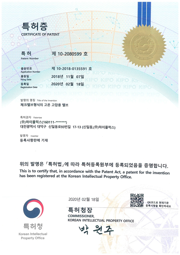 명칭 : 체크밸브 형식의 고온 고압용 밸브