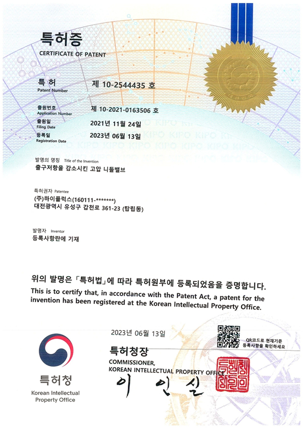 명칭 : 출구저항을 감소시킨 고압 니들밸브