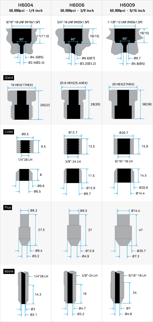 Medium Pressure부터 Gland 내에 Collar와 Nipple을 이용하여 제품을 체결하며 해당되는 배관 사이즈는 아래와 같습니다. 제품간 연결시 필요한 니플(Nipple)은 사용자가 원하는 길이로 주문 가능하며 당사의 툴링 셋(Tooling set)도구를 이용하여 직접 가공할 수도 있습니다. 이 Cone and thread 방식 연결은 최적의 밀폐 방식으로 높은 압력과 온도에서 액체와 기체 모두 신뢰할 수 있는 성능을 발휘하며 쉽고 빠른 고압 장비 구성을 위한 표준입니다.